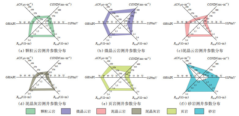 通过分析测井相-岩相蛛网图,可直接确定每种岩性的敏感曲线,颗粒云岩测井曲线呈中低值特征(图 4a);微晶云岩的COND分布显著区别于其他岩性,呈中高COND值特征(图 4b);泥晶云岩与泥晶灰岩测井曲线分布特征相似,其他岩性均呈低值特征(图 4c,4d);通过高GR的分布特征可有效区分页岩(图 4e);砂岩的SSP分布是区别其他岩性的显著特征,呈现高SSP-高AC的组合特征(图 4f),与产能、岩心及微观薄片检验,该方法识别精度为63.5%,存在无法对所有区域的岩性进行识别的局限性。