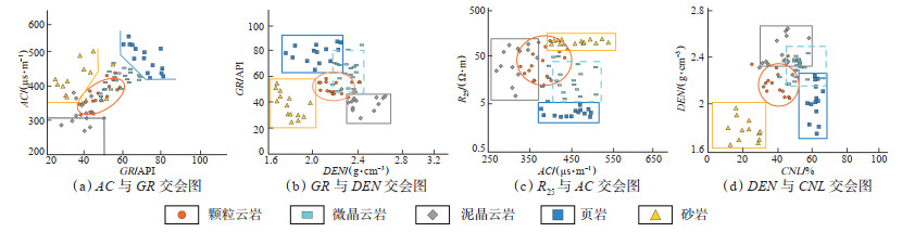 通过上述蛛网图分析,发现局部岩性未能有效区分,且存在重叠区域。因此,引入密度(DEN)、2.5 m底部梯度电阻率(R25)和中子(CNL)曲线,采用交会图法进行分析。通过对研究区岩心及测井曲线形态和变化幅度特征进行分析,确定岩石的敏感曲线为GR,AC,DEN,R25和CNL。选择不同岩性的敏感曲线进行两两组合交会分析,可实现对岩性的精确识别。选取资料完整的钻井,以厚度大于35 cm且岩性一致的样品作为研究对象,排除岩性变化的过渡界面,准确读取测井曲线的数值,为建立岩石测井识别的定量化模型奠定了基础。