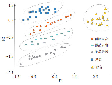 由表 3可知,主成分F1与F2累计贡献率达90.75%,可代替样本总数据,数据损失最小。将F1与F2的特征值提取,并与输入测井曲线数据进行计算,建立岩性判别模型
