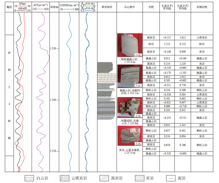 将测井参数应用于敏感因子数学模型中,计算出主成分F1与F2的权重,将主成分F1与F2投影至岩性敏感因子交会图,实现岩性分类。在1 237.8~ 1 239.4 m层段,SP呈基线特征、GR值为38~57 API,AC值为352~412 μs/m,COND值为488~513 ms/m、RILD值为1.96~2.33 Ω·m,常规测井呈低SSP、低GR、低AC、低COND、高RILD等特征,主成分F1为0.562,主成分F2为0.681,根据表 1和敏感因子数学模型,综合判断该层段岩性为颗粒云岩。1 248.0 m附近SP出现负异常,而此处AC为250 μs/m,与砂岩定量分析范围不符,此处的F1为0.659,F2为0.566,符合颗粒云岩特征,综合判定为颗粒云岩,经微观薄片观察确认,该处颗粒云岩受风暴搅动强烈,陆源碎屑含量高,故呈现SP负异常现象。