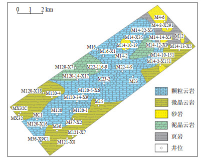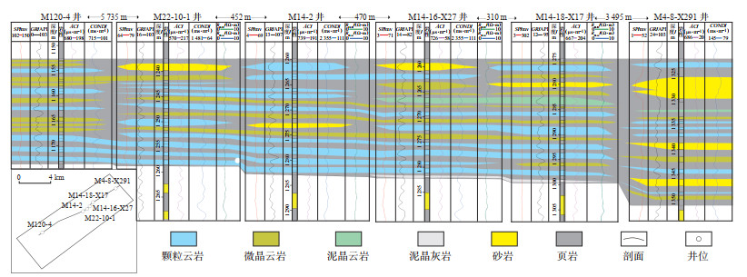 依据上述岩性识别方法,将东营凹陷八面河地区沙四段所有井的测井参数带入岩性判别模型,进行岩性识别,总结岩性展布特征。垂向上颗粒云岩在沙四段4砂组广泛发育(图 8),4砂组底部颗粒云岩发育稳定。M14-16-X27井附近处于构造低部位,水体较深,出现小规模泥晶灰岩,4砂组沉积时期处于湖侵域,随着水体逐渐加深和咸度降低,颗粒云岩逐渐过渡为微晶云岩和泥晶云岩。M4-8-X291井靠近东部物源区,受风暴砂岩影响,导致地层厚度增大,碳酸盐岩减少、砂岩与页岩增多。