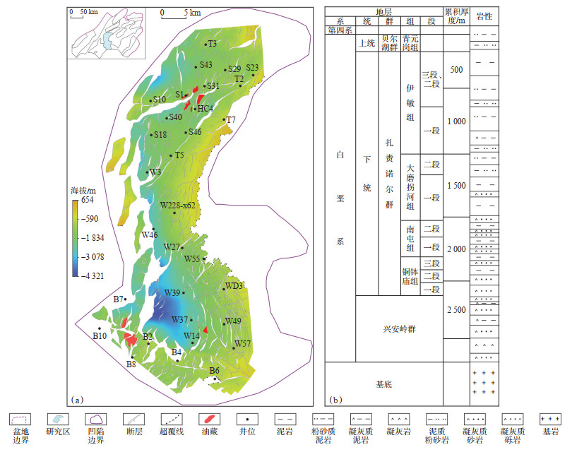下载原图 图 1 海拉尔盆地乌尔逊凹陷油藏分布特征(a)和白垩系岩性地层综合柱状图(b) Fig. 1 Characteristics of reservoir distribution(a)and stratigraphic column(b)of Urxun Depression, Hailar Basin |