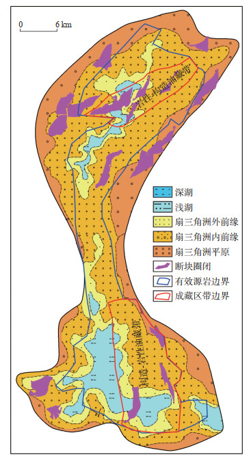 乌尔逊凹陷铜钵庙组泥岩具有较大的生烃潜力,油源对比证实铜二段泥岩对铜三段油藏贡献较大,铜二段为自生自储油藏。铜钵庙组顶部沉积的辫状河三角洲砂砾岩,受不整合面风化淋滤的影响,发育优质储集层;乌南、乌北次凹局部发育砂泥互层分布区,在不整合面及上覆南屯组泥岩盖层控制下形成构造、构造-地层、构造-岩性多种圈闭,具备一定规模[39-41],可分别开展它源供烃为主的铜三段油藏和自生自储的铜二段油藏勘探(图 10)。乌北洼槽发育一定规模的有效烃源岩,扇三角洲外前缘和内前缘发育有效储层,与断块圈闭叠合,形成岩性-构造油藏带;乌南洼槽发育大面积的有效烃源岩,与其紧邻的乌东斜坡带扇三角洲外前缘和内前缘相带发育有效储层,与不同断阶的断块圈闭叠合,形成构造-岩性油藏带[42-43]。这2个成藏区带可作为乌尔逊凹陷铜钵庙组下步甩开勘探的有利区带(图 11)。