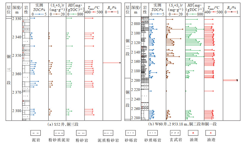 乌尔逊凹陷铜钵庙组烃源岩目前研究较少。对乌尔逊凹陷铜钵庙组泥岩进行了系统的地球化学取样分析(包括岩心和岩屑,总计109块),铜三段TOC平均值为1.20%,S1+S2平均值为3.11 mg/g,有机质类型为Ⅱ1—Ⅱ2型,Ro平均值为0.91%,处于成熟—高熟阶段,综合评价为中等烃源岩;铜二段TOC平均值为0.87%,S1+S2平均值为3.01 mg/g,有机质类型为Ⅰ—Ⅱ2型,Ro平均值为0.99%,处于成熟—高熟阶段,综合评价为中等烃源岩;铜一段TOC平均值为0.72%,S1+S2平均值为1.20 mg/g,有机质类型为Ⅱ1—Ⅱ2型,由于钻遇该段探井样品均分布在断陷边部埋深较小,Ro平均值为0.69%,处于低熟—成熟阶段,综合评价为差烃源岩(表 1)。通过对各洼槽各小层烃源岩丰度、类型和成熟度评价,认为铜钵庙组整体发育TOC平均值为1%、类型以Ⅰ—Ⅱ2型为主的中等烃源岩,铜二段泥岩相对较好,部分为Ⅰ型烃源岩(图 2)。图 2b为W60井铜钵庙组地球化学柱状图,铜二段中部发育厚度为57 m的好烃源岩,泥岩最大单层厚度为13 m,TOC平均值为1.22%,S1+S2平均值为5.19 mg/g,HI平均值为446 mg(g·TOC),Tmax平均值为448 ℃,底部Ro为0.78%,可大量生油。