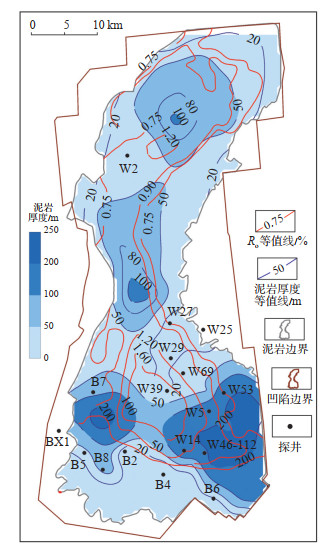 根据钻井资料,结合地震资料预测结果显示,在乌北和乌南洼槽铜钵庙组发育厚度为50~200 m的暗色泥岩,Ro为0.6%~1.5%,其中Ro ≥ 0.75% 的面积为858 km2,资源基础优越(图 3)。