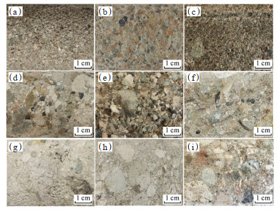 下载原图 图 5 海拉尔盆地乌尔逊凹陷白垩系铜钵庙组储层岩心照片 (a)“贫泥”同级颗粒支撑粗砂岩,S3304井,2 248.88~2 249.18 m;(b)“贫泥”同级颗粒支撑细砾岩,W45井,1 897.02~1 897.22 m;(c)“贫泥”同级颗粒支撑含砾粗砂岩,W6601井,1 733.38~1 733.58 m;(d)“含泥”多级颗粒支撑砾岩,WX69井,3 081.58~3 081.28 m;(e)“含泥”多级颗粒支撑砾岩,W60井,1 772.18~1 772.38 m;(f)“含泥”杂基支撑中砾岩,W68井,3 480.10~3 480.3 m;(g)“富泥”杂基支撑砾岩,S1901井,1 920.92~1 921.17 m;(h)“富泥”杂基支撑中砾岩,WX69井,3 090.03~3 090.23 m;(i)“富泥”杂基支撑砂砾岩,S20井,2 419.81~2 419.91 m。 Fig. 5 Core photos of the Tongbomiao Formation reservoir in Urxun Depression, Hailar Basin |