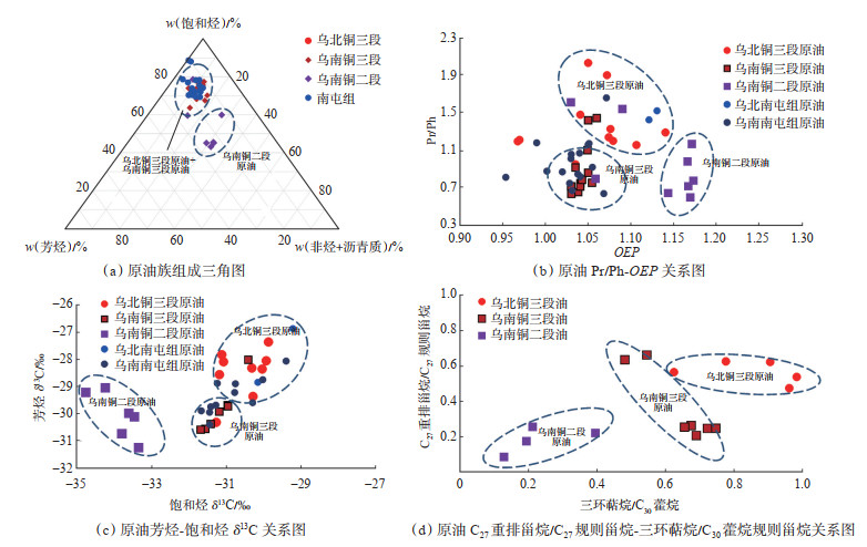 (2)研究区铜钵庙组原油可分为3类,分别为乌北铜三段原油、乌南铜三段原油和乌南铜二段原油。乌北铜三段原油高饱和烃,姥植比高,饱和烃与芳烃δ13C偏重,C27重排甾烷和三环萜烷含量高。乌南铜三段原油具有高饱和烃、饱和烃与芳烃δ13C偏轻,C27重排甾烷和三环萜烷含量中等。乌南铜二段原油饱和烃含量低,OEP值高,饱和烃与芳烃δ13C轻,C27重排甾烷和三环萜烷含量低。