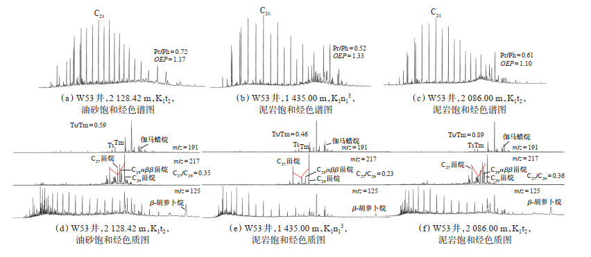 通过对铜钵庙组原油的族组成、色谱、色质、δ13C等特征进行分析,乌尔逊凹陷铜钵庙组原油可分为3类(图 6)。乌北铜三段原油饱和烃质量分数为71.32%,姥植比为1.90,饱和烃δ13C为-31.01‰,芳烃δ13C为-28.47‰,C27重排甾烷/C27规则甾烷为0.65,三环萜烷/C30藿烷为0.97。乌南铜三段原油饱和烃质量分数为69.38%,姥植比为0.86,饱和烃δ13C为-31.11‰,芳烃δ13C为-29.83‰,C27重排甾烷/C27规则甾烷为0.50,三环萜烷/C30藿烷为0.88。乌南铜二段原油饱和烃质量分数为53.33%,姥植比为0.72,饱和烃δ13C为-33.85‰,芳烃δ13C为-30.05‰,C27重排甾烷/C27规则甾烷为0.19,三环萜烷/C30藿烷为0.23。