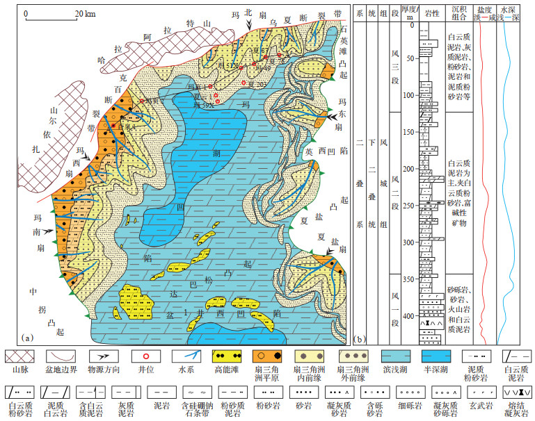 下载原图 图 1 玛湖凹陷二叠系风城组沉积相(a)及岩性地层综合柱状图(b) Fig. 1 Sedimentary facies(a)and stratigraphic column(b)of Permian Fengcheng Formation in Mahu Sag |