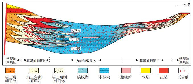 玛湖凹陷风城组优质烃源岩的分布区域控制着页岩油的高产区域。玛湖凹陷风城组属于典型且稀有的古老碱湖沉积,在玛湖凹陷半深湖和滨浅湖区域沉积有陆源细粒颗粒、碳酸盐岩和有机质等混合沉积物。这些沉积物分别形成粉砂岩类、泥岩类和白云岩类烃源岩,且热演化程度位于生油窗,为玛湖凹陷油气聚集提供了丰富的油源条件。由凹陷中心向凹陷边缘依次分布着页岩油聚集区、致密油聚集区和常规油聚集区(图 10)。其中,凹陷中心及附近的页岩油是在自生自储的条件下形成“自封闭”油气富集;凹陷斜坡区致密油是在油气经过短距离运移后,在浮力与喉道毛细管力达到平衡时形成油气聚集;凹陷边缘的常规油是在圈闭中形成油气聚集。
