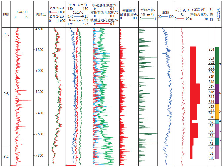 玛湖凹陷风城组优质页岩油储层控制着页岩油的高产层段。依据玛湖凹陷玛51井风城组页岩油产量特征(图 11),发现优质页岩油储层主要体现在具有较高的长英质矿物含量、有效孔隙度值、游离油孔隙度值、裂缝密度和脆性指数等。