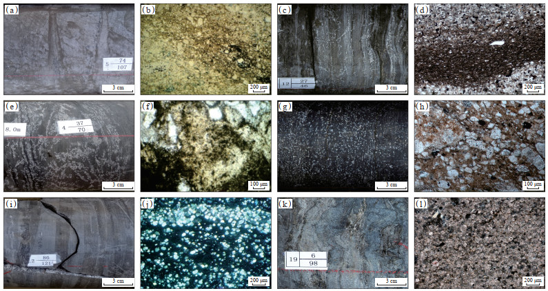 下载原图 图 2 玛湖凹陷风城组页岩油储层岩心样品及薄片特征 (a,b)含云质粉砂岩,玛页1井,4 634.37 m;(c,d)碳酸盐化极细粒砂岩,夏203井,4 708.94 m;(e,f)含灰质云质泥岩,玛页1井,4 613.03 m;(g,h)凝灰质碳酸盐质泥岩,夏203井,4 727.40 m;(i,j)含泥质微晶云岩,玛页1井,4 736.19 m;(k,l)微晶云岩,夏203井,4 773.45 m。 Fig. 2 Core smaples and thin section characteristics of shale oil reservoir of Fengcheng Formation in Mahu Sag |