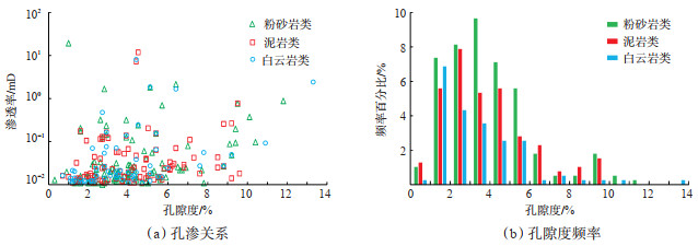 统计玛湖凹陷玛页1井和夏203井风城组共计408个储层样品的孔隙度和渗透率的分析结果可知,风城组储层孔隙度为0.2%~13.3%,平均值为3.84%;渗透率为0.01~19.3 mD,平均值为0.21 mD;孔隙度与渗透率呈较弱的正相关性(图 3a)。在孔隙度值分布范围方面,粉砂岩类、泥岩类、白云岩类页岩油储层的孔隙度值分布范围均相对较大,涵盖常规、常规—致密和致密储层的孔隙范围;在孔隙度值分布频率方面,粉砂岩类、岩类页岩油储层的孔隙度值频率分布均呈现2个主峰,分别为1%~6% 和9%~10%;白云岩类页岩油储层的孔隙度值频率分布呈现单峰,主峰为1%~6%(图 3b)。
