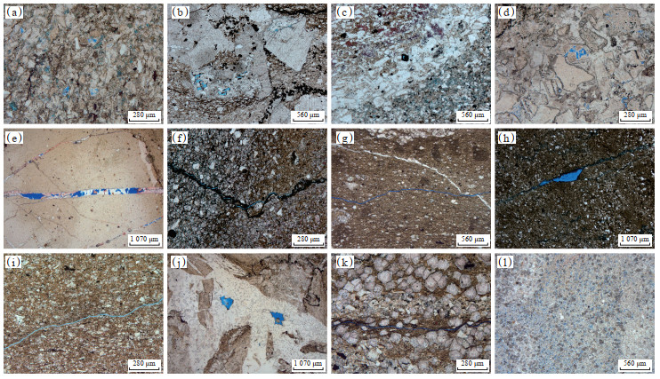 下载原图 图 4 玛湖凹陷风城组页岩油储层样品铸体薄片 (a)含云质粗粉砂岩,溶蚀孔,玛页1井,4 612.31 m;(b)含碳酸盐泥质粉砂岩,溶蚀孔,夏203井,4 678.34 m;(c)含碳酸盐质含泥细粒—极细粒砂岩,溶蚀孔,夏203井,4 685.66 m;(d)含云质细粒—极细粒砂岩,溶蚀孔,玛页1井,4 607.92 m;(e)泥岩,半充填缝,玛页1井,4 579.90 m;(f)碳酸盐质含粉砂泥岩,压溶缝,夏203井,4 682.87 m;(g)凝灰质含云泥岩,构造缝、溶蚀孔,玛页1井,4 702.64 m;(h)含灰粉砂质泥岩,构造缝、溶孔,夏203井,4 688.68 m;(i)泥质微晶云岩,构造缝,夏203井,4 744.10 m;(j)碎裂化云岩,晶间孔,玛页1井,4 817.94 m;(k)凝灰质细晶云岩,构造缝、溶蚀孔,玛页1井,4 684.80 m;(l)凝灰质粉晶云岩,溶蚀孔,玛页1井,4 686.72 m。 Fig. 4 Thin section characteristics of shale oil reservoir samples of Fengcheng Formation in Mahu Sag |