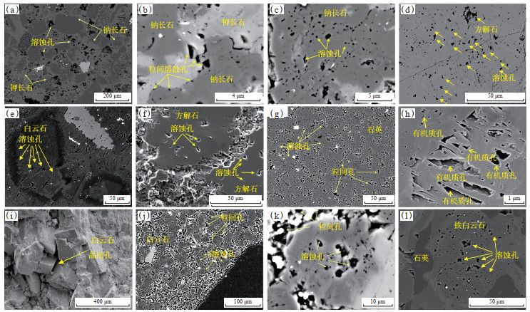 下载原图 图 5 玛湖凹陷风城组页岩油储层样品氩离子抛光-扫描电镜特征 (a)凝灰质粉砂岩,长英质矿物溶蚀孔,玛页1井,4 790.02 m;(b)灰质粉砂岩,钾长石和钠长石粒间溶蚀孔,夏203井,4 670.2 m;(c)灰质粉砂岩,方解石、钠长石溶蚀孔,夏203井,4 670.2 m;(d)白云质粉砂岩,方解石溶蚀孔,夏203井,4 688.94 m;(e)白云质泥岩,白云石溶蚀孔,玛页1井,4 636.59 m;(f)灰质泥岩,方解石溶蚀孔,夏203井,4 802.6 m;(g)硅质泥岩,石英颗粒粒间孔、溶蚀孔,玛页1井,4 692.56 m;(h)含云质泥岩,有机质孔,夏203井,4 654.64 m;(i)白云岩,白云石晶间孔,玛页1井,4 857.41 m;(j)白云岩,白云石粒间孔、溶蚀孔,夏云1井,5 374.09 m;(k)白云岩,白云石粒间孔、溶蚀孔,夏云1井,5 374.09 m;(l)白云岩,铁白云石溶蚀孔,玛湖54井,5 394.57m。 Fig. 5 Argon ion polishing scanning electron microscopy characteristics of shale oil reservoir of Fengcheng Formation in Mahu Sag |