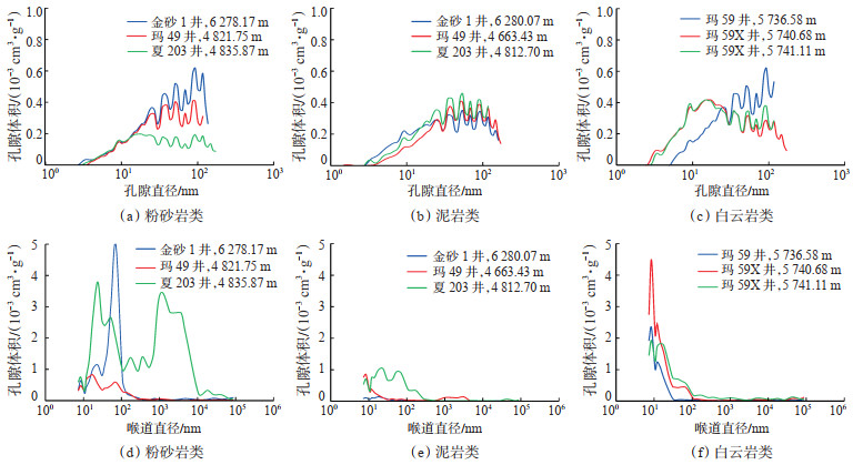 为了定量评价玛湖凹陷风城组各类储层的孔径分布特征,分别对风城组粉砂岩类、泥岩类和白云岩类等页岩油储层的岩心样品进行低温氮气吸附实验和高压压汞实验分析。将样品研磨为60~80目(1目= 25.4 mm)粉末,进行洗油、烘干处理,在-195.85 ℃下使用比表面分析仪ASAP2460对样品进行低温氮气吸附实验,获得储层岩心样品孔隙小于200 nm的孔隙体积分布特征。同时,对相对深度储层岩心柱塞样品进行洗油、烘干处理,利用AutoPore Ⅳ 9520全自动压汞仪,测量不同尺寸喉道连通的孔隙体积。