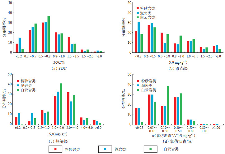 统计玛湖凹陷玛页1井和夏203井风城组共计568个粉砂岩类、泥岩类和白云岩类页岩油储层样品的有机地球化学参数(表 1)可知,粉砂岩类、泥岩类和白云岩类页岩油储层样品的有机碳质量分数(TOC)平均值分别为0.72%,0.64% 和0.68%,液态烃(S1)质量分数平均值分别为0.75 mg/g,0.70 mg/g和0.74 mg/g,热解烃(S2)质量分数平均值分别为2.28 mg/g,1.87 mg/g和2.10 mg/g,氯仿沥青“A”质量分数平均值分别为0.243%,0.212%和0.233%;有机质类型主要为Ⅰ—Ⅱ型干酪根。在成熟度方面,风城组有机质镜质体反射率(Ro)为0.71~1.21%,平均值为1.00%,有机质热演化程度处于生油窗范围内。风城组粉砂岩类页岩油储层TOC,S1,S2和氯仿沥青“A”等的平均质量分数均相对最高,其次为白云岩类和泥岩类。风城组粉砂岩类和白云岩类页岩油储层中TOC,S2和氯仿沥青“A”等的含量均较高的样品分布频率较高,泥岩类页岩油储层中S1含量较低的样品分布频率较高(图 7)。