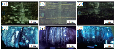 下载原图 图 8 玛湖凹陷风城组页岩油储层样品荧光特征 (a)泥质、白云质粉砂岩,厚层块状结构,普遍含油,微裂缝、层理缝和毫米级溶蚀孔含油性最好,玛页1井,4 707.15~4 707.39 m;(b)白云质泥页岩夹白云质粉砂岩,薄纹层状结构,层理缝和白云质粉砂岩纹层含油,玛页1井,4 708.35~4 708.58 m;(c)泥质、粉砂质白云岩,厚层块状结构,微裂缝含油,玛页1井,4 716.06~ 4 716.36 m;(d)泥质、白云质粉砂岩,厚层块状结构,普遍含油,微裂缝、层理缝和毫米级溶蚀孔含油性最好,夏203井,4 711.61~ 4 711.72 m;(e)白云质泥页岩夹白云质粉砂岩,薄纹层状结构,层理缝和白云质粉砂岩纹层含油,夏203井,4 747.55~4 747.75 m;(f)泥质白云岩夹白云质粉砂岩团块,厚层块状结构,微裂缝和白云质粉砂岩团块含油,夏203井,4 711.13~4 711.30 m。 Fig. 8 Fluorescence characteristics of shale oil reservoir samples of Fengcheng Formation in Mahu sag |