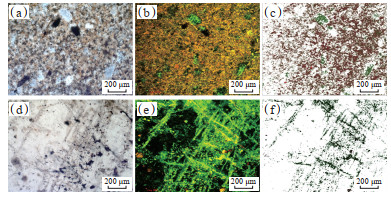 注:重组分为红色;轻组分为绿色。 (a—c)含白云质粉砂岩,分别是单偏光、共聚焦扫描和轻重组分提取图像,玛页1井,4 634.37 m;(d—f)白云质泥岩,分别是单偏光、共聚焦扫描和轻重组分提取图像,玛页1井,4 725.05 m。 Fig. 9 Distribution characteristics of hydrocarbon light and heavy components of Fengcheng Formation shale oil reservoir in Mahu Sag |