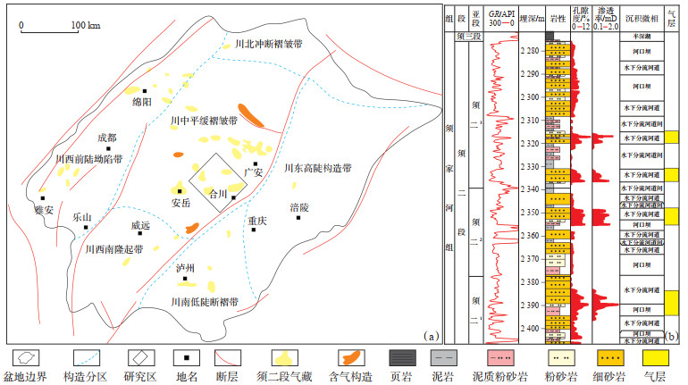 1 地质概况研究区HC地区位于四川盆地川中平缓褶皱带东南部,是一个近北东向展布的低缓背斜构造,构造稳定、次级构造不发育,仅局部见少量低幅度鼻状隆起[12](图 1a)。晚三叠世,随着古特提斯洋逐渐闭合、印支板块向扬子板块靠拢,上扬子地块结束了被动大陆边缘盆地,进入挤压构造背景下的陆相盆地演化阶段,研究区依次沉积了上三叠统须家河组,侏罗系自流井组、凉高山组和沙溪庙组等多套碎屑岩。须家河组为温暖潮湿气候条件下沉积的内陆河湖交替陆源碎屑岩,可分为六段,其中须一段、须三段、须五段岩性以黑色页岩、泥岩为主,夹薄层泥质粉砂岩、煤层或煤线;须二段、须四段和须六段岩性主要为灰色中砂岩、细砂岩和粉砂岩。
