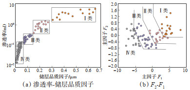 从研究区须二段高压压汞测试、核磁共振和CT测试结果可知,储层的岩石类型、储集空间类型、微观孔隙结构和宏观物性间差异显著,是决定气井产能的关键。在取心段储层类型划分的基础上,优选对泥质含量、碎屑颗粒分选性、物性、含气性最敏感的补偿中子(CNL)、深测向电阻率(Rt)、声波时差(AC)、岩石密度(DEN)等测井曲线,利用岩心刻度常规测井,对优选的测井曲线进行主成分分析,提出2个主因子,其中主因子F1 = -0.88 DEN + 0.89 CNL+0.95 AC-0.81 Rt,F2= -0.37 DEN-0.23 CNL+ 0.12 AC+0.53Rt。从计算结果可知,须二段4种类型储层的测井响应特征和主因子F1和F2均存在较大差异(图 11b)。