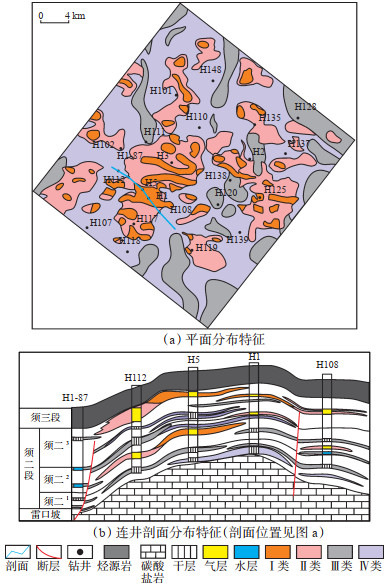 4.2.2 储层分布特征将上述储层分类方法推广到研究区未取心段,开展各类储层分布预测。结果显示:Ⅰ类储层呈窄条带状分布在H1,H5,H3和H125等井区;Ⅱ类储层呈连片状分布在H117,H109和H101等井区;Ⅲ类储层呈团块状、宽带状,分布在临近Ⅱ类储层的H111,H2等井区;Ⅳ类储层发育相对连续,全区均有发育,如H118,H110和H137等井区。纵向上,Ⅰ类和Ⅱ类储层主要发育在须二段上部的须二3和须二2亚段,Ⅲ类和Ⅳ类储层在下部须二1段中常见(图 13)。