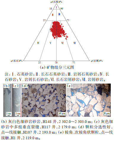 须二段砂体发育连续性好且厚度大(图 2b,2c),储层中填隙物含量较低,体积分数为3.68%~ 12.16%,其中泥质杂基含量最高,体积分数为2.11%~ 10.48%,平均为4.86%,胶结物体积分数为0.56%~ 4.65%,平均为2.79%,以石英、伊利石、绿泥石和方解石为主,含少量高岭石和白云石。须二段砂岩结构成熟度较高,分选性较好(图 2d),分选系数为1.42~1.81,磨圆度中等—较好,碎屑颗粒呈次棱角- 次圆状,颗粒间为点-线或线接触(图 2e)。