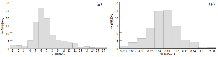 下载原图 图 3 川中HC地区三叠系须二段砂岩孔隙度(a)和渗透率(b)分布直方图 Fig. 3 Histogram of porosity(a)and permeability(b)distribution in sandstone reservoirs of the second member of Triassic Xujiahe Formation in HC area, central Sichuan Basin |