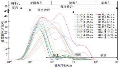 下载原图 图 4 川中HC地区三叠系须二段致密气储层核磁孔径分布 Fig. 4 Distribution of pore radius in tight gas reservoirs of the second member of Triassic Xujiahe Formation in HC area, central Sichuan Basin |
