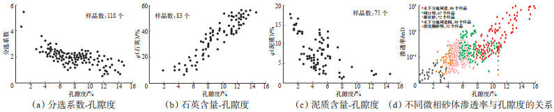 随砂体一起沉积的泥质含量,也是破坏储层物性的重要因素,通常沉积时水动力越强,石英、长石粗碎屑颗粒含量越高,泥质等细粒碎屑越不易沉淀。研究区物性与不同类型碎屑颗粒含量的关系表明,储层物性与石英、长石等稳定矿物含量总体呈正相关关系,而与泥质含量则呈明显负相关关系(图 6a—6c)。对研究区不同沉积微相砂体进行物性统计,结果表明:水下分流河道和河口坝砂体发育厚度大、颗粒粒度大,沉积时水动力强,以细砂岩、中砂岩沉积为主,经过河水的充分淘洗,碎屑颗粒中石英、长石等粗碎屑含量较高,而泥质杂基的含量较低,物性较好,岩心测试水下分流河道的孔隙度与渗透率分别为7.86%~16.42%(平均为11.85%)、0.12~9.14 mD(平均为1.12 mD),河口坝砂体的孔隙度为5.86%~12.16%(平均为8.63%),渗透率为0.08~1.28 mD(平均为0.58 mD)(图 6d)。席状砂搬运距离远、沉积时水动力较弱,以薄层的粉砂岩沉积为主,储层中泥质杂基含量高,石英和长石含量较低,物性较差,孔隙度为3.82%~8.13%(平均为4.56%),渗透率为0.01~0.74 mD(平均为0.28 mD)。滨浅湖砂坝和水下分流河道间沉积时水动力最弱,沉积物粒度最小,以泥质粉砂岩沉积为主,泥质含量高,物性最差,孔隙度普遍小于5.00%,其中滨浅湖砂坝孔隙度一般为2.32%~ 4.61%,渗透率为0.01~0.28 mD;水下分流河道间孔隙度为0.25%~4.16%,渗透率为0.01~0.08 mD,基本无储集能力。