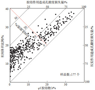 (1)压实作用。研究区须二段视压实率为45.0%~73.0%,平均为54.0%,压实作用造成须二段孔隙度损失14.60%~20.10%,平均为17.4%。这表明强烈的压实作用是造成初始孔隙度损失的重要原因[16],这与研究区须二段粒间体积与胶结物关系所指示的“由压实作用导致的孔隙度损失远大于胶结作用”的结论是一致的(图 8)。