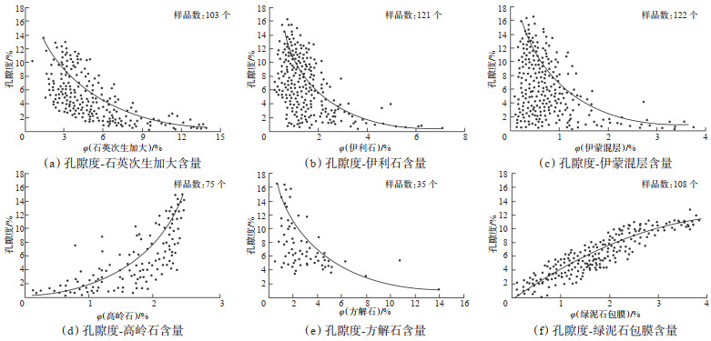 下载原图 图 6 川中HC地区三叠系须二段不同沉积微相砂体物性与矿物含量的关系 Fig. 6 Relationship between porosity and permeability of different sedimentary facies of the second member of Triassic Xujiahe Formation in HC area, central Sichuan Basin |