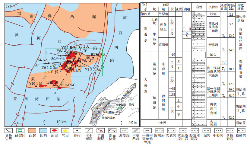 1 地质概况垦利6-1油田位于渤海南部海域莱北低凸起构造带上,该构造带北临黄河口凹陷、南临莱州湾凹陷、东与庙西凹陷相接、西南部为青东凹陷(图 1a),整体呈北东—南西走向的“S”形。钻井揭示垦利6-1油田新生界自下而上依次发育古近系始新统沙河街组三段—一段、渐新统东营组、新近系中新统馆陶组与明化镇组下段、上新统明化镇组上段及第四系平原组,整体缺失古新统,沙三段局部缺失,东营组则缺失东一段[15]。该油田的主力油层分布在新近系明化镇组下段。新近系明化镇组下段目前划分为5个油组,Ⅴ油组为砂泥岩互层,泥岩多为偏还原环境下的绿灰色,部分为红褐色泥岩,Ⅴ油组沉积晚期后,可容纳空间开始加大,沉积了一套广泛分布的砂体。纵向上油气主要富集于新近系明化镇组下段Ⅴ油组,油气藏类型以岩性-构造油气藏与岩性油气藏为主[16]。新近系明化镇组下段沉积时期湖盆整体呈坳陷状态,发育多期辫状河三角洲,岩性主要为粉—细砂岩、中砂岩与厚层褐灰色泥岩。储层岩性以中—细粒岩屑长石砂岩为主,砂岩成分主要为石英、长石、岩屑。碎屑颗粒分选中等—好,磨圆度次棱—次圆状[17]。新近系明化镇组下段储层平均孔隙度为30.6%,平均渗透率为1 349.3 mD,高孔、高渗储层。根据目前探井揭示情况,目的层水下分流河道砂体纵横向相互叠置,储层厚度变化较快,主河道砂体厚度一般为8~10 m。