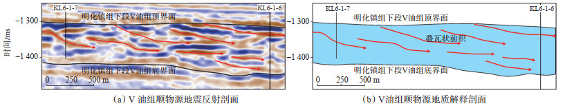 渤海湾盆地垦利6-1油田新近系明化镇组Ⅴ油组沉积时期,古地形较为平坦,平均地形坡度小于1°,陆源碎屑物质在宽缓的古地形上沉积,形成Gilbert型三角洲沉积体。通过顺物源方向的地震剖面发现,新近系明化镇组Ⅴ油组具有明显的低幅叠瓦状前积反射特征(图 10a)。由于沉积时期水体较浅,河流引力起主要控制作用,水下分流河道下切且不断向前推进。由于河道的频繁摆动,Ⅴ1小层内砂体为多期次水下分流河道垂向切叠复合而成,目前解释该小层的复合砂体平均厚度为8.72 m,单一期次水下分流河道砂体厚度为3~6 m(参见图 5a),加之所切地震剖面并不是沿某一水下分流河道,因而地震同相轴表现为中强振幅、弱连续性、低角度的特点。进一步说明沉积时期,湖盆水体收缩,可容纳空间变小,沉积物不断向湖盆中心方向推进,水下分流河道砂岩延伸距离远,进积作用明显(图 10b)。