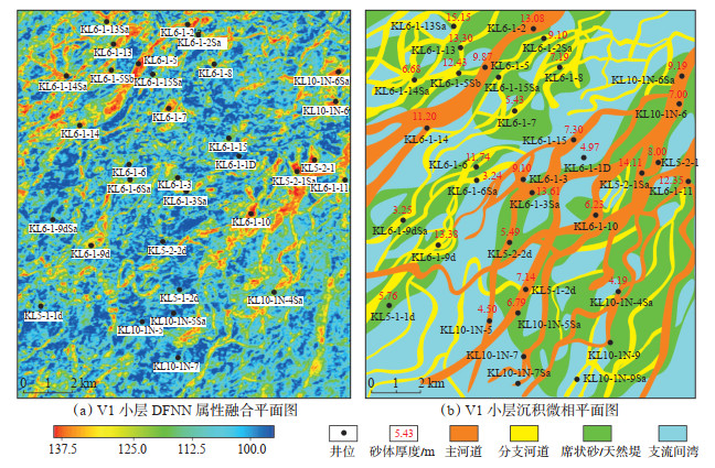 地震属性的本质是地震波对地质体岩层物理性质及其变异直接引起的地震信号综合响应。由于单纯从地震体中利用数学算法提取相关地震属性,无人为干扰或者测井信息的介入,可信度高[26-27]。因此,地震属性预测作为一种简便快捷的手段通常被用来刻画储层展布。然而,不同地震属性对地质体的属性敏感程度也不一样,如地质体的岩性、地质体内所含流体及地质体本身的结构等等。为使有用地震信息损失最小,需要优选对地质体反映敏感的地震属性来开展储层展布预测。本次研究定性、定量优选出匹配程度较高的原始振幅90°相移、30 Hz、35 Hz、40 Hz、RMS及平均振幅等6种属性。通过Eerge Training模块,运用DFNN方法多属性提取,经过拟声波曲线的控制和筛选,主要运用共轭梯度法进行调节,优选迭代次数,最终得到深度学习神经网络地震体。利用地震多属性融合和地震切片技术,可进一步明确有利储层的宏观分布(图 11a)。在单井沉积相特征综合分析基础上,结合剖面沉积相对比,利用基于深度学习的多属性储层智能预测方法,精细刻画了新近系明化镇组下段主力产油层Ⅴ1小层沉积相平面分布。Ⅴ1小层发育20条水下分流河道,水下分流河道整体呈北东南西向展布,分流河道砂体顺流向分叉展布,表现出明显的条带性,具有良好的延伸性特征(图 11b)。水下分流河道延伸距离为5.2~20.1 km,平均长度为10.06 km,宽度为64~420 m,平均宽度为219.65 m,平均厚度约9.42 m。平面西北部发育一条较宽河道,宽约500~800 m,直井中KL6-1-14井、KL6-1-5井、KL6-1-2井均在该河道中,砂体厚度约10 m,储层物性好,油层发育。中部河道与西北侧和东南侧的水下分流河道相比规模较小,河道宽度为100~300 m,砂体较薄。Ⅴ1小层是垦利6-1油田新近系明化镇组下段Ⅴ油组的主力油层,通过定性、半定量的的河道砂体刻画,明确了有利储层的平面分布特征,进而为下一步开发井位的实施提供了直接地质依据。