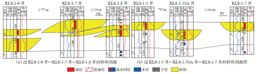 在低幅叠瓦状前积沉积样式的指导下,利用砂体顶面高程差异、砂体侧向“厚—薄—厚”特征、砂体侧向叠置等构型关系,刻画了研究区Ⅴ1小层砂体的空间展布特征。图 12a为一北东南西向顺物源砂体剖面图,在顶拉平的基础上,依据各井砂体发育位置以及厚度特征,明确了该方向砂体的前积样式及弱连续性的特征。切物源方向的北东向剖面(图 12b)显示,研究区Ⅴ1小层水下分流河道砂体发育,但多呈孤立状,井间横向变化快,连续性差。后期注水开发调整过程中,应根据井网井距特征,充分考虑储层连通性的地质基础,避免无效注水或者注水不见效等生产问题。
