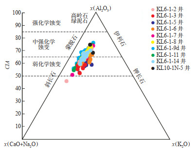 下载原图 图 2 渤海湾盆地垦利6-1油田新近系明化镇组下段砂岩风化程度的A-CN-K三角图[21] Fig. 2 A-CN-K triangle diagram of the weathering degree of sandstone in the Neogene lower member of Minghuazhen Formation of Kenli 6-1 Oilfield, Bohai Bay Basin |