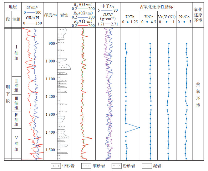 V,Cr,Co,Ni,Th等元素的含量及其比值可作为恢复古氧化还原环境的判别指标,同时稀土元素中Ce异常和Eu异常也可指示环境改变。冯乔等[22]通过U/Th法、V/Cr法、Ni/Co法与V/(V+Ni)法开展过氧化—还原条件的综合判别并给出了对应的判别标准(表 1)。利用该方法表征了单井氧化还原环境垂向变化特征(图 3),KL6-1-6井氧化还原垂向变化图中U/Th的值最大为1.19,最小为0.20,平均为0.27,指示明下段沉积期主要是氧化环境,在Ⅳ油组沉积初期和Ⅴ油组沉积末期为短暂的贫氧环境;微量元素V/Cr的值最大为0.67,最小为0.42,平均为0.51,整体比值都小于2.00,指示明下段沉积期为氧化环境;微量元素V/(V+Ni)的值最大为0.89,最小为0.79,平均为0.86,指示整体沉积环境为贫氧环境;微量元素Ni/Co的值最大为3.13,最小为2.47,平均为2.77,指示整体沉积环境为贫氧环境。综上所述,研究区明下段沉积环境为弱氧化—弱还原的浅水环境。