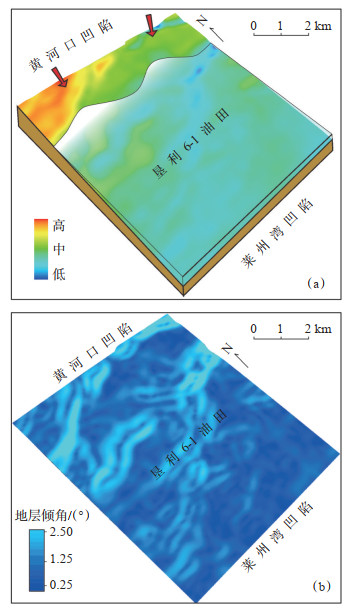 古地貌是控制一个含油气盆地沉积相发育与分布的一个主要因素,同时在一定程度上控制着油藏的储盖组合及油藏分布,恢复古地貌是油气勘探中必不可少的因素[23]。在渤海湾盆地垦利6-1油田区域,新近系明化镇组下段沉积较为稳定,古构造平缓,属于浅水环境。将新近系明化镇组底界面作为一个相对等时界面,向上为Ⅴ油组沉积时期,Ⅴ油组地层厚度变化不大,且顶部发育一套泥岩,代表一等时界面,其在钻井上易识别,地震合成记录标定波形清晰,在地震剖面上易追踪对比,因此研究主要利用残余厚度法进行古地貌恢复。明下段Ⅴ油组古地貌图(图 4a)表明,新近系明化镇组下段Ⅴ油组沉积时期,古地形起伏不大,整体较为平缓。莱北低凸起新近系明化镇组明下段沉积时期处于盆地裂后热沉降阶段,构造稳定,馆陶组和明化镇组沉积厚度稳定,沉积中心逐渐向北部渤中凹陷迁移。为进一步量化地形坡度,在Petrel软件中先利用Ⅴ油组顶面构造减去底面构造得到Ⅴ油组的残余厚度,在沿Ⅴ油组底面构造下倾方向测量单位距离的高程差(残余厚度),根据直角三角形原理tanα =高程差/两点之间距离,即可计算出某一点处倾角,根据各点处计算的倾角插值,可得到新近系明化镇组下段Ⅴ油组沉积时期的古地形倾角平面图(图 4b)。结果表明,新近系明化镇组下段Ⅴ油组沉积时期古地形坡度为0~2°,平均坡度小于1°,整体坡度较小,沉积比较稳定,符合浅水三角洲的主要特征。