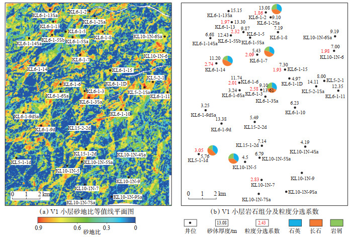 砂地比指的是砂体厚度与地层厚度的比值,在沉积物源分析过程中可作为一个重要指标。在三角洲沉积过程中,越靠近物源方向,沉积物供给充分,砂地比值较大。新近系明化镇组Ⅴ油组Ⅴ1含砂率高值区分布在研究区西北部、东部,整体由北东向南西方向逐渐降低(图 5a)。砂地比值超过了60% 的沉积区,具有明显的条带状特征且连续性好。由此说明新近系明化镇组Ⅴ油组沉积时期物源供给能力强,连续分布的砂体因物源供给充分,延伸距离较远。分选系数,石英、长石、岩屑含量及其比值可用来判断沉积物源供给能力强弱。粒度分选系数越大,说明粒径分散程度越高,粒度累积曲线上累积颗粒直径分布在75% 处的细粒沉积物所占比重越大,间接反应了沉积水动力弱,物源供给能力较小。通过研究区12口井Ⅴ1小层分选系数综合分析发现,研究区分选系数大多小于2.5,且研究区东北部粒度分选系数整体小于西南部分选系数,反映了研究区东北部物源供给充足(图 5b)。从6口井的矿物组分来看,Ⅴ1小层沉积时期,石英含量普遍偏小,长石和岩屑含量较大,指示了相对近源的沉积过程且物源供给充分。