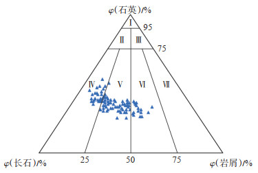 综合利用垦利6-1油田新近系明化镇组下段Ⅴ油组的岩心及薄片资料分析认为,垦利6-1油田新近系明化镇组下段储层岩性以中—细粒岩屑长石砂岩为主(图 6),砂岩成分主要为石英、长石、岩屑。岩石成分石英体积分数为30%~38%,长石体积分数为42%~49%,其中钾长石占优势,体积分数为27%~40%;斜长石含量相对较少,体积分数为8%~ 18%;岩屑体积分数为14%~26%。根据投点结果可知,研究区目的层段岩石类型以岩屑长石砂岩为主,其次为长石砂岩和长石岩屑砂岩,为近源搬运、沉积的结果。
