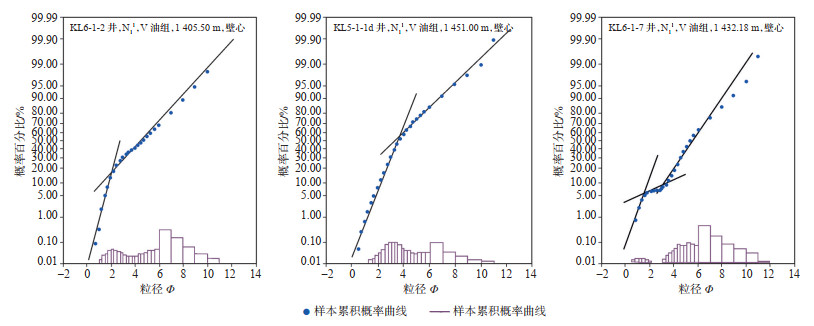 粒度分析的目的是研究沉积物大小和分布,通常利用粒度概率累积曲线来进行表征。依据滚动、跳跃及悬浮组分直线段的陡缓来反映沉积物的分选好坏和水动力强弱。通过对KL6-1-2井、KL5-1-1d井、KL6-1-7井的样品进行分析,研究区明下段粒度概率曲线以二段式为主,反映了以跳跃、悬浮为主的搬运特征,碎屑粒径为0.02~0.14 mm,沉积物以中砂岩为主、细砂岩次之,反映了较强的水动力特征(图 7)。