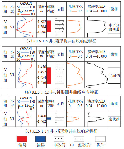 研究主要选取了自然伽马(GR)及电阻率(RD)测井曲线进行综合分析,通过研究其幅度和形态的变化来分析不同沉积微相的类型。根据渤海湾盆地垦利6-1油田新近系明化镇组区域沉积特征,在钻井取心的精细描述和沉积相划分的基础上,总结了研究区不同砂体在测井曲线上的不同特征,主要包括钟形、箱形和指形三大类,以钟形、箱形为主。KL6-1-5井在1 381~1 386 m深度段的箱形曲线整体幅度较高(图 9a),顶、底部均为突变,代表了一段砂岩沉积,整段地层上下岩石的颗粒变化不大,往往可见齿状,说明砂岩中有薄层泥岩。这种形态反映了强水动力的沉积环境,也指示了主河道、分流河道沉积。KL6-1-5 D井在1 450~1 457 m深度段的测井曲线形态(图 9b)所示,研究区钟形曲线一般为中高幅,向上逐渐变小,顶部渐变,底部突变,呈钟形。测井曲线形态代表了沉积粒度上细下粗,反映了碎屑沉积物的供应速度和强度自下而上逐渐减弱、由强到弱的水动力特征,通常发育于主河道、分支河道。研究区指形曲线一般为低幅,尖突状,呈手指形。KL6-1-14井(图 9c)所示,指形曲线往往反映的是在整体水动力环境偏弱的环境中出现了相对较强的水动力环境,通常指示了席状砂沉积。