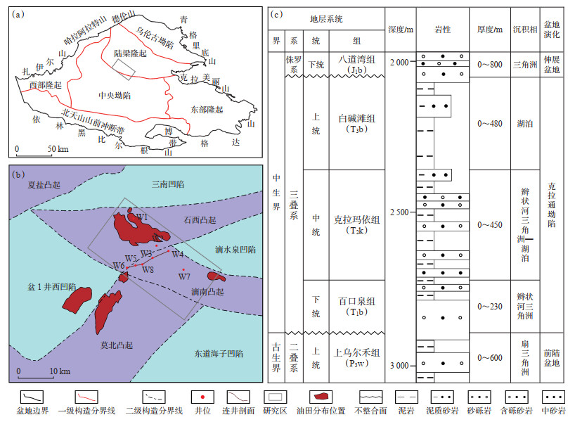 1 地质概况准噶尔盆地是晚石炭世—第四纪沉积的复合型叠合盆地,可分为中央坳陷、陆梁隆起、乌伦古坳陷、西部隆起、北天山山前冲断带和东部隆起等6个一级构造带(图 1a)。石西地区位于准噶尔盆地陆梁隆起南部,包含石西凸起的西南部地区和滴水泉凸起的西部地区,西邻盆1井西凹陷,并与夏盐凸起相望,东连滴南凸起和滴水泉凹陷,南接莫北凸起,北侧连三南凹陷,具有“四面环凹”的构造格局(图 1b)。研究区三叠系自下而上依次发育百口泉组(T1b)、克拉玛依组(T2k)和白碱滩组(T3b)(图 1c),百口泉组为本次研究的目的层,厚度为0~ 230 m,岩性以砂砾岩和砂岩为主,夹少量泥岩,主要发育辫状河三角洲沉积。按照内部岩性组合特征,可将百口泉组分为3段,自下而上依次为百口泉组一段、百口泉组二段和百口泉组三段,其中百口泉组一段岩性主要是砂砾岩,发育少量的泥岩夹层;百口泉组二段下部以砂砾岩为主,向上逐渐过渡为泥岩沉积;百口泉组三段主要为泥岩,可见薄层砂岩。