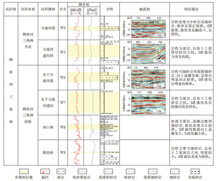 综合分析认为研究区东北部(W4和W3井所处区域)主要发育辫状河三角洲平原亚相,以分流河道和分流河道间湾微相为主;西南部(W8、W5和W6井所处区域)主要发育辫状河三角洲前缘亚相,包含水下分流河道和水下分流河道间微相,局部区域发育河口坝和席状砂微相。