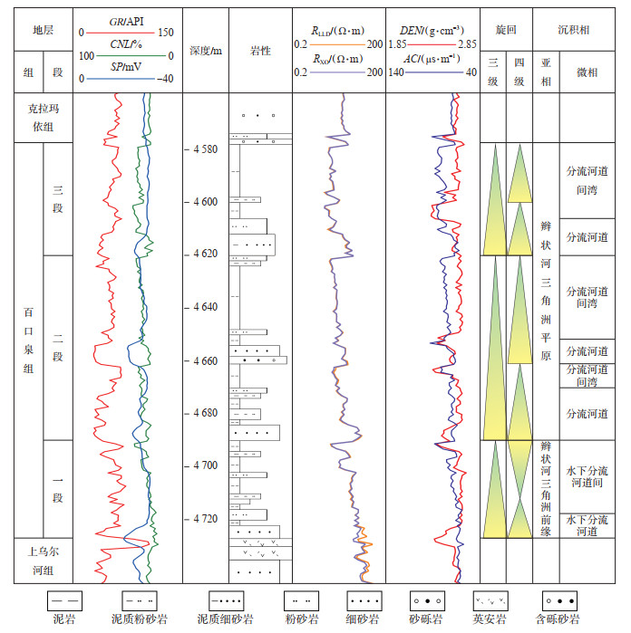 3.1.2 单井沉积相特征以W3井为例,分析百口泉组沉积相特征(图 5)可知,百口泉组一段底部岩性主要为细砂岩,中部是粉砂岩和泥质粉砂岩互层,顶部岩性主要为泥岩,颗粒粒度从下至上逐渐变小,整体呈现出正旋回特征,为辫状河三角洲前缘亚相,发育水下分流河道和水下分流河道间微相。百口泉组二段下部发育一套灰色的细砂岩,往上泥质含量逐渐增加,过渡为泥岩,中部发育薄层的含砾砂岩,顶部发育厚层泥岩,表现为正旋回特征,为辫状河三角洲平原亚相,分流河道和分流河道间湾微相叠置发育。百口泉组三段与百口泉组二段的岩性特征相似,底部发育灰色泥质砂岩,向上粒度逐渐变小,中上部发育厚层紫红色泥岩夹薄层泥质粉砂岩,呈正旋回特征,为辫状河三角洲平原亚相,发育分流河道和分流河道间湾微相。