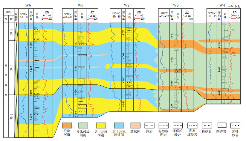 为了进一步揭示研究区百口泉组沉积体系的横向展布规律,选取了一条位于区域中部的顺物源方向(北东—南西)W4—W3—W8—W5—W6连井进行解剖。结果表明:百口泉组的发育厚度从北东—南西逐渐增大,即随着古地貌的地势降低,地层厚度变大;地势高部位W4和W3井砂岩段SP和RT测井曲线表现为箱形、钟形和高值锯齿状,地势中部位W8井的SP和RT测井曲线形态主要为指状和针状,在百口泉组底部的大套砂岩内呈箱形和钟形;地势低部位W6和W5井的砂岩段SP和RT测井曲线表现出更多的突变高值,说明这2口井所在位置更靠近湖盆中心,更易受到湖平面的影响(图 6)。
