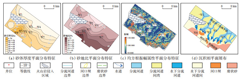 综合分析认为研究区西南部(W5和W6井区)及南部的3个高振幅区为百口泉组沉积中心;东北部发育辫状河三角洲平原亚相,向西南方向逐渐过渡为辫状河三角洲前缘亚相,中部和东部地区主要发育分流河道和水下分流河道微相,这些微相被分流河道间湾和水下分流河道间微相分隔,向西南进入三角洲前缘亚相后,发育河口坝和席状砂微相(图 7d)。
