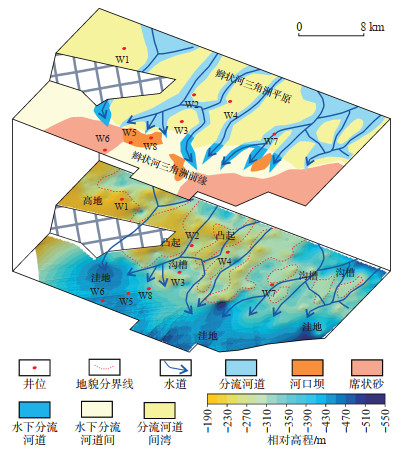 3.2 古地貌控制沉积相平面展布研究区古地貌与沉积相叠合图(图 8)显示,古地貌单元对沉积相的展布特征有明显的控制作用,具体表现为来自东北部的物源通过河流长距离输送至西部、西南部洼地沉积,沉积物在经辫状河三角洲砂体向湖盆中心输送的过程中,6条古沟槽提供了较大的容纳空间,是主要的输送通道,同时,沟槽单元水动力较强,细粒沉积物被搬运,粗粒沉积物则残留,沉积了较厚的砂岩储层,发育水下分流河道微相;沟槽间的凸起水动力较弱,细粒沉积物如粉砂和泥质更易堆积,形成较厚的泥质层,发育水下分流河道间湾微相,在河道之间起阻挡或分流的作用;西南部洼地区域因河道扩展导致水动力减弱,细砂质沉积形成大面积砂体聚集,发育大面积席状砂微相。综上所述,古地貌的形态和特征直接影响沉积物的来源、搬运路径和沉积环境,进而对储层的岩性、物性及空间分布产生重要影响。