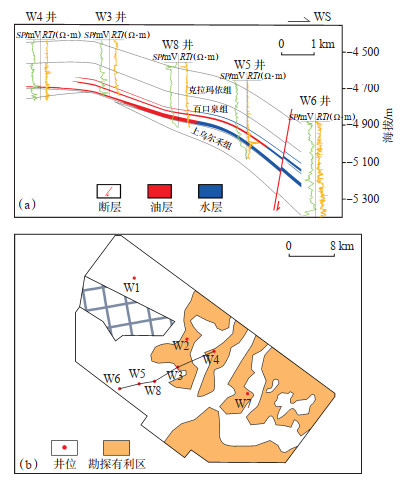 从石西地区北东—南西向W4—W3—W8—W5—W6井百口泉组连井油藏剖面(图 9a)可知,位于古地貌高部位的W4和W3井油藏发育厚度较小,仅为4~10 m,向西南部油藏的厚度逐渐变大,西南洼地W5井和W6井油藏厚度达到最大,为30~40 m。